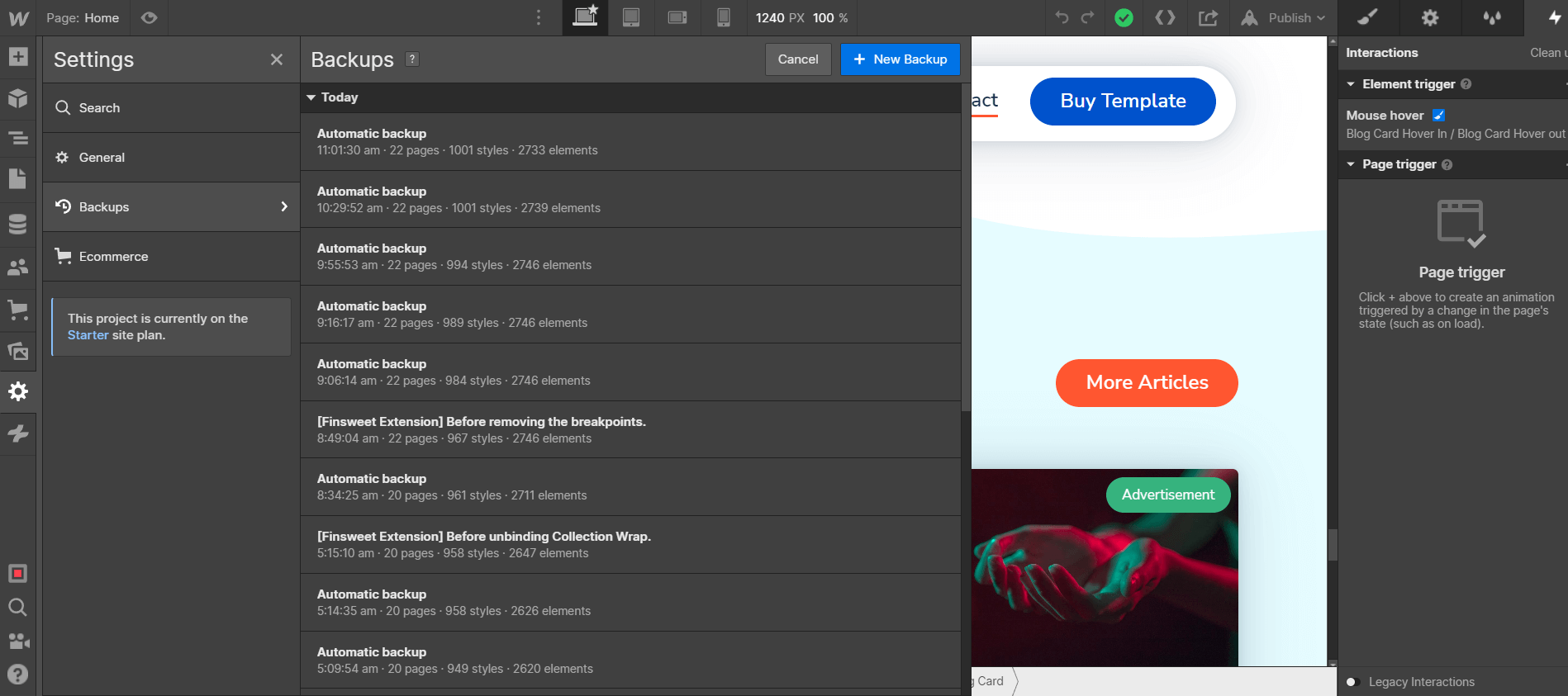 If something goes wrong, for example, if you are not liking where the website is going to, if you deleted some critical classes that were required to make the Template look nice, or if you just want to go to a previous version for any reason, you can always go to the Backups section.